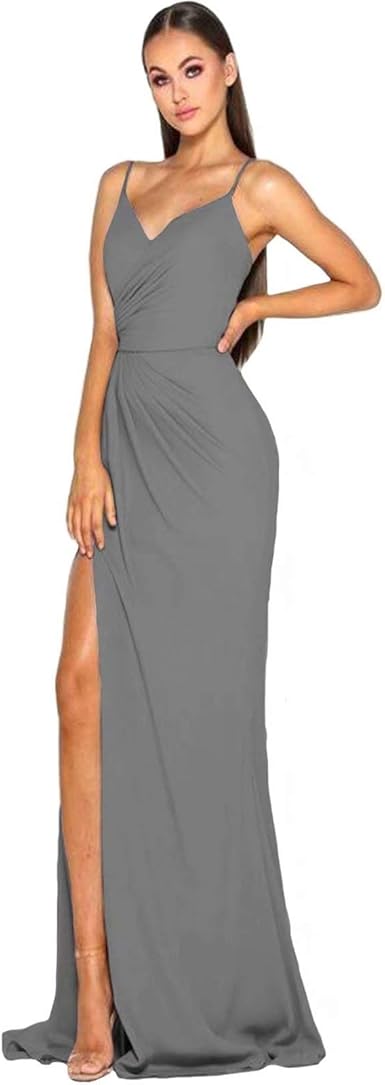 Prom Brideswmaid Dresses Long Spaghetti Straps Deep V Neck Formal Gowns Ruffles Evening Dress With Slit At Amazon Women S Clothing Store
